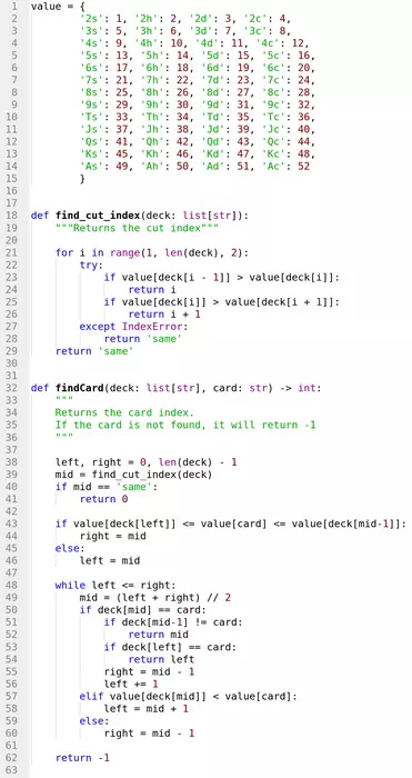 Можно найти карту, проверяя каждую карту в колоде по очереди. Если карта будет последней, то придётся проверить всю колоду. Можно сделать это быстрее. Если бы была стандартная отсортированная колода, то делим колоду пополам и если средняя карта является искомой, то возвращаем индекс карты, иначе ищем её в той половине, которая содержит искомую карту. Повторять, пока область поиска не сузится до одной карты или пока карта не будет найдена. Если карта не найдена, то выводим -1