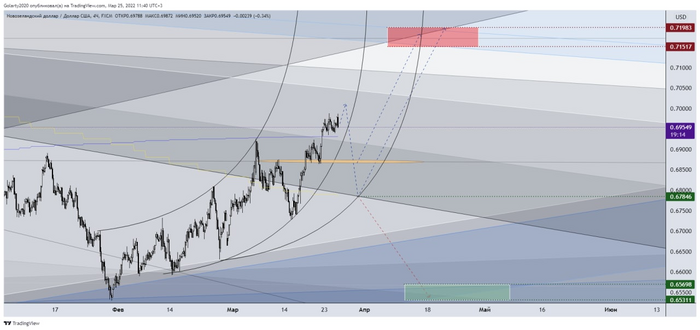 Растущая динамика близка к своему локальному завершению, так как для продолжения роста (который сейчас является приоритетным) необходим по вероятности тест промежуточного оранжевого угла (0.68650). Растущий сценарий актуален до тех пор, пока зона ~ 0.67850 находится под контролем быков.