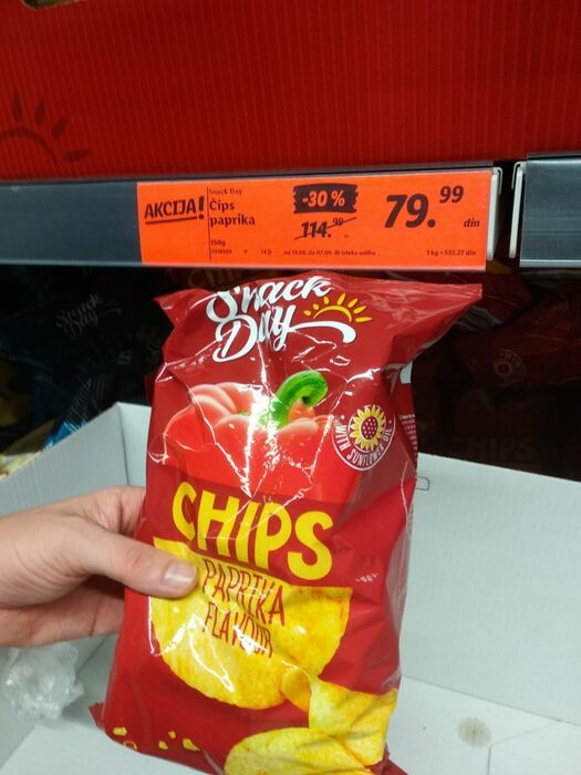 Купил по акции на пробу со скидкой 30% Снек Дей 150 гр. за 45 примерно русских рублей (последняя фота). Средненько весьма, Лейс явно лучше.