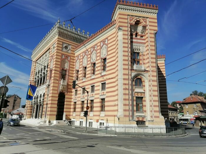 Сараевская виечница (мэрия), построена австро-венгерскими архитекторами в 1892-1894 гг. в период австрийского владычества. Экскурсовод рассказала, что с этого места по договорённости расселяли людей, которые жили там до постройки. Но один чел упирался и ни в какую не соглашался переезжать. В итоге, власти едва уговорили переехать чела за большую плату и перенос его дома в целости и сохранности на противоположный берег Миляцки (протекает как раз за дорогой, около которой стоит виечница). Мы с риэлтором впечатлились , что более 100 лет назад тут уже были и соблюдались реальные права человека, у нас в РФ бы просто взорвали нахуй дом вместе с челом и дело с концом.