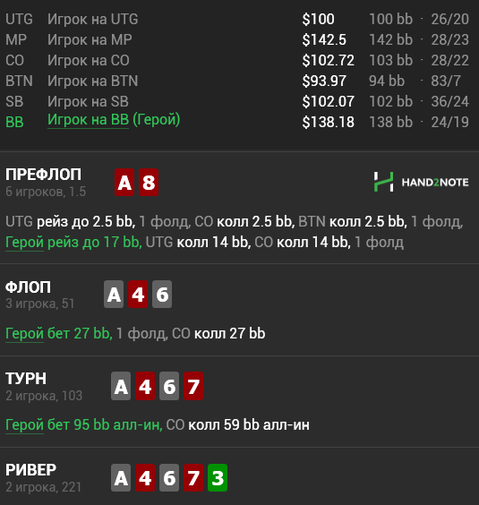 Мой опп. был стандартный АВС игрок с выигрышем на ш-д 57%, даже если и он будет блефовать в нас, то не достаточно часто, поэтому я со спокойной душой скинул.
