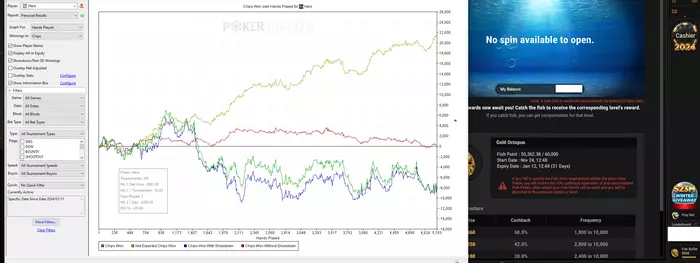 В 17-ом меня изъяли из оборота и вот только вновь в строю. Катаю с 13-го. Тогда гундели, что на старзах ГСЧ резкий, чтоб не сказать подкрученый, но то что я увидел сейчас но покерке - это просто верх пидарства или диспы, как сказали бы оптимисты. Короче депнул чутка, катаю всё как на старых старзах ничего необычного, вдруг в один момент всё начинает резко заходить-доезжать, всякие бэкдоры и дро, тройники на ривере. В итоге две финалки и хороший плюс. И нет ни каких иллюзий, что я второй veeea или охуенно фартовый - ясное понимание-ощущение, что это алгоритм для вновьдепнувшего. Всё подтвердилось далее. Пошёл сплошной мусор, порой до смешного, посчитал 100 рук не одной пары ни одной одномастной руки, и далее как дадут руку так переедут. Раньше сталкивался с мнением , что после заноса люди типа начинают играть лузовее и дороже и в этом духе, но нихуя друзья - спецом затайтился 8/8 и на тех же лимитах . В итоге обнулился. Через день смотрю видео Козленко с veeea и там veeea роняет фразу: "ГСЧ конечно на ГГ кошмарный" и показывает свой график, на тот момент чёта -70К за 400 турниров - пазл сложился.