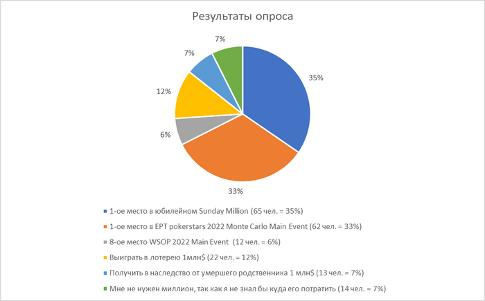 Наибольшее количество голосов получили варианты 1-ое место в юбилейном Sunday Million и 1-ое место в EPT pokerstars 2022 Monte Carlo Main Event. Разница между ними составила всего 3 человека и в любой момент все могло поменяться. Худшим же вариантом пользователи посчитали 8-ое место WSOP 2022 Main Event. Надо отдать должное, что этот вариант тесно взаимодействует с такими вариантами как получить в наследство от умершего родственника 1 млн$ и мне не нужен миллион, так как я не знал бы куда его потратить. Разница между всеми тремя вариантами всего 1 человек.