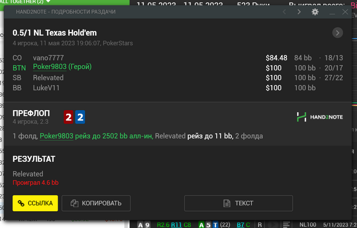 A_NAVI40K_K, почему-то в hand2note она попала с ошибкой. Если посмотреть на саму раздачу в программе, то там будет строчка Poker9803: raises $1.50 to $2.502h2d и из-за отсутствия пробела между ставкой и картами, прога считала это как ставку в 2502$. в поддержке мне посоветовали попробовать удалить историю этой руки из архива, а потом сделать импорт всех рук в новую базу данных. Пока решил ничего из этого не делать.