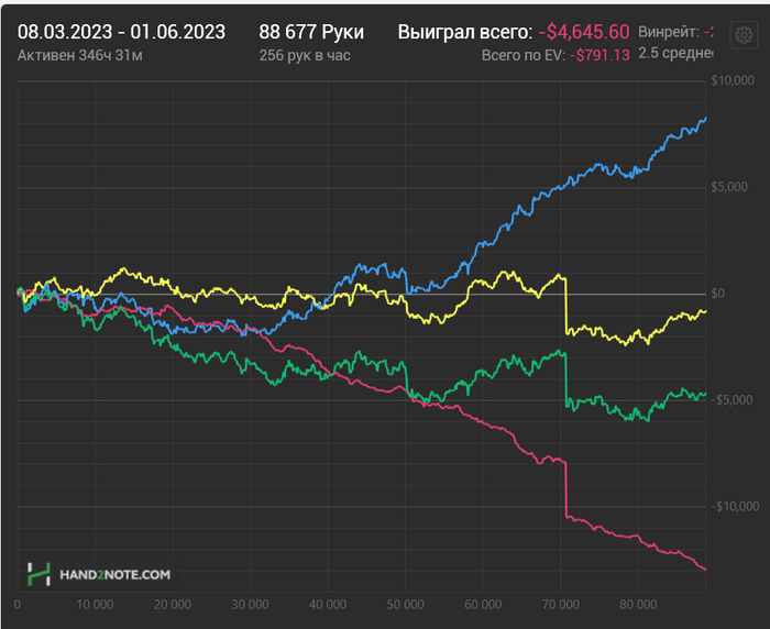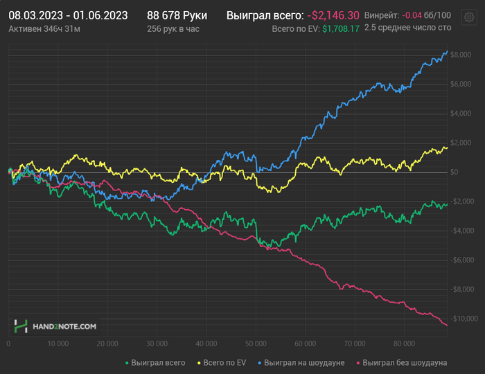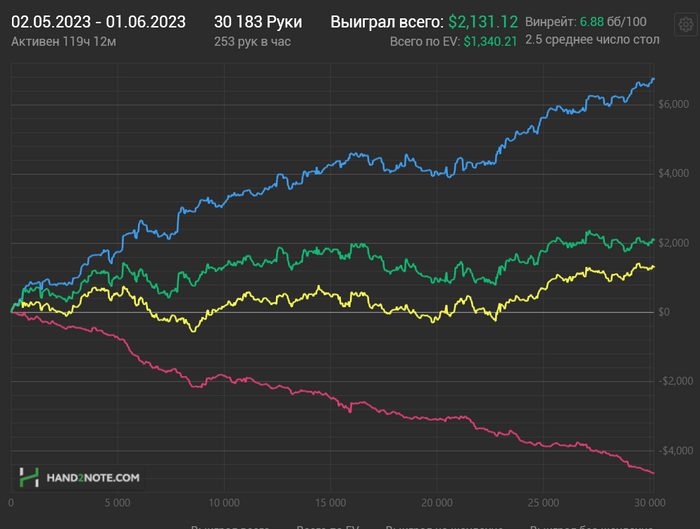 Начал май я все еще на волне энтузиазма, а вот к середине месяца уже сдулся. Упала продуктивность, желание играть, обучаться. За месяц отыграл 115/125ч. и 16.5/40 ч. теории. В целом вышло 131,5ч., что а) не так уж и плохо, учитывая, что вторую половину месяца я играл крайне мало и б) очень плохо, если планирую дальше развиваться в покере.