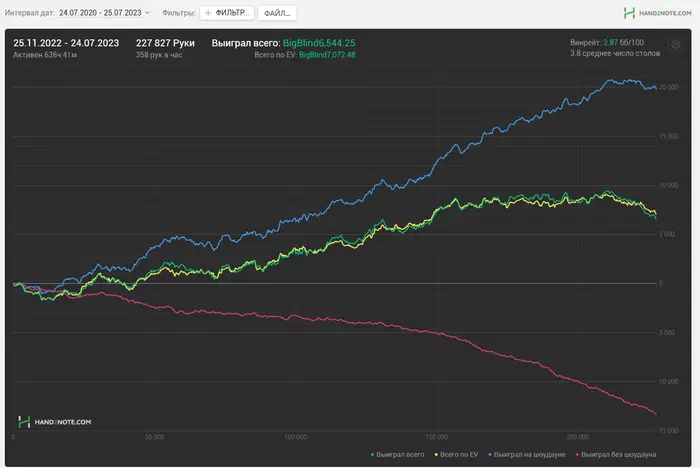 Тут нет и 60к рук, которые у него на скрине, а значит они отыграны уже осенью или где-то ещё, о чём я не знал, а также видно, что у нас с ним даже получилось реанимировать красную (хотя, конечно 18к рук это совсем не о чём)