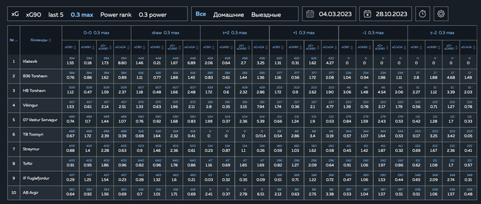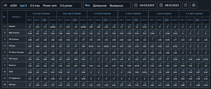 Автобеттинг — это, по сути, завершающая стадия всей работы. Наиболее наглядным объяснением будет показать на примерах, как все развивалось лично у меня. В самом начале я делал ставки вручную, анализируя матчи по xG статистике, и только по ней. Для анализа я использовал десятки показателей xG статистики (для примера приведу показатели команд из чемпионата Фарерских островов):
