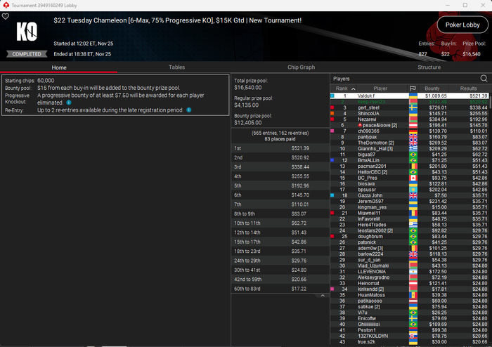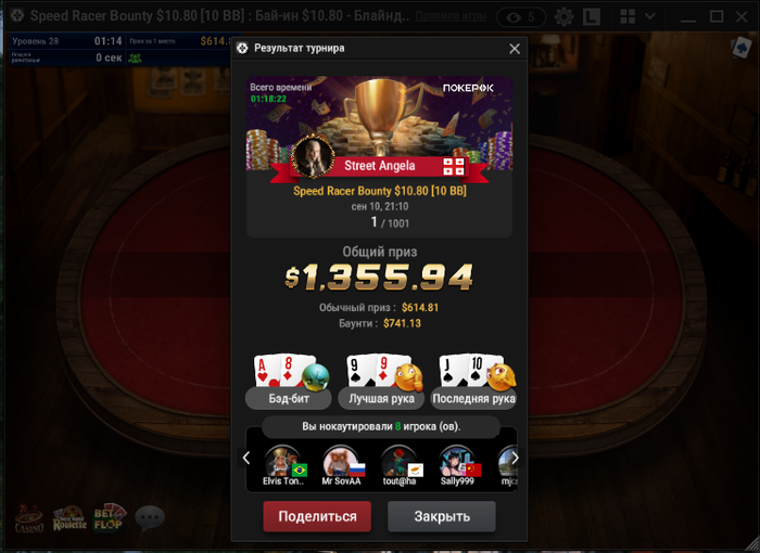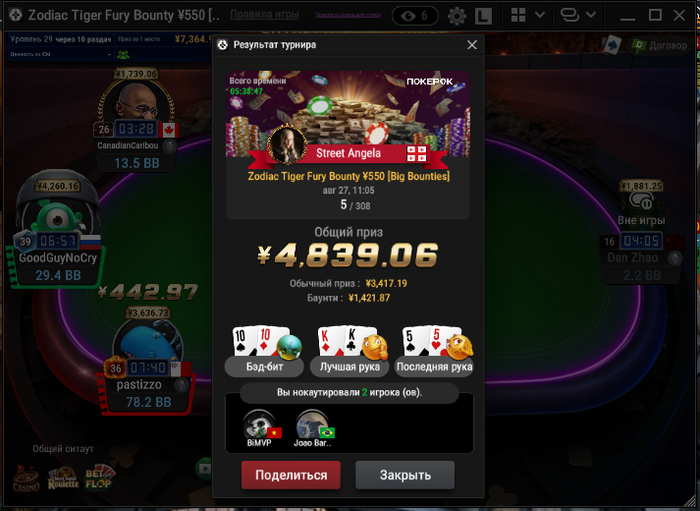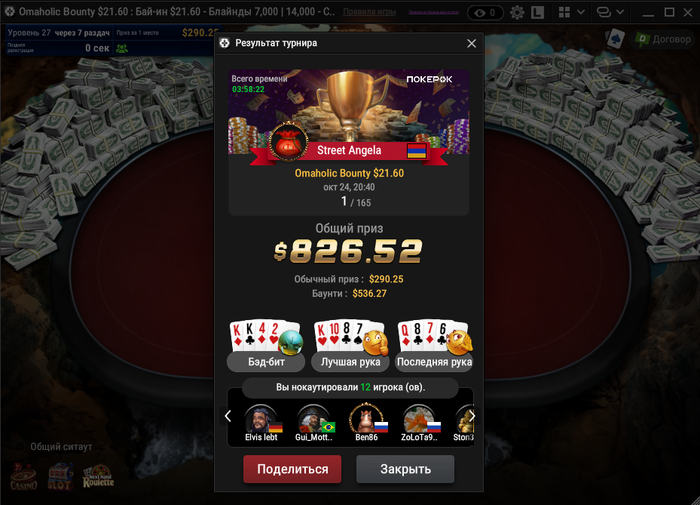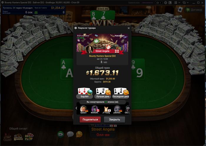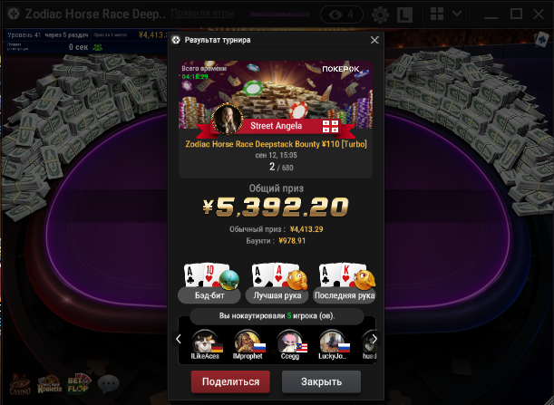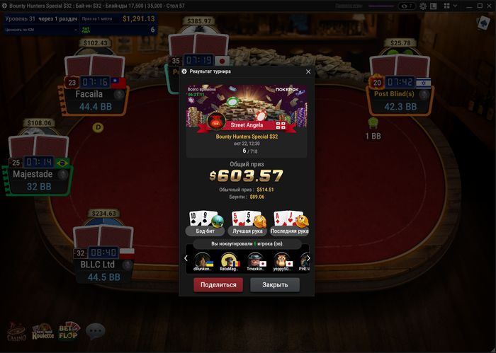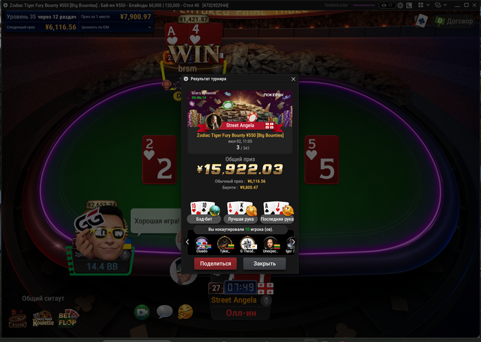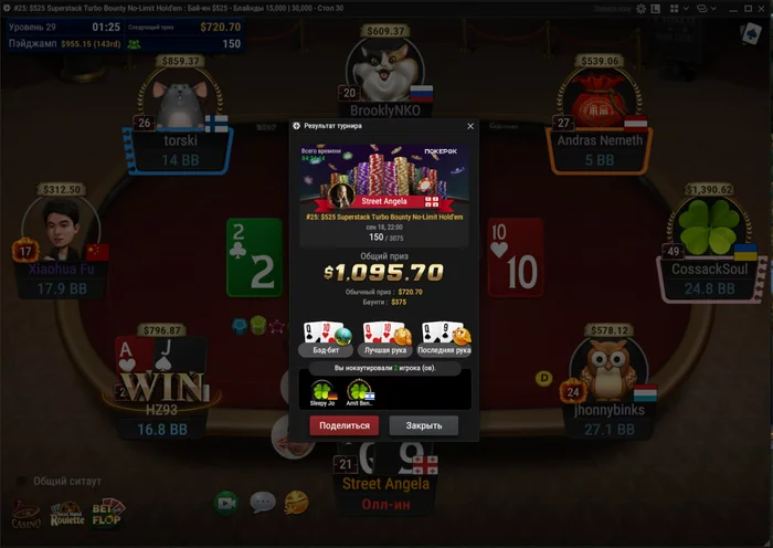 Из плюсов — сыграл три кольцевика. В 525-м прошёл в призы, и это хороший знак. Но, как назло, за столом сидел Андраш Немет (Probirs) — топ-рег хайлимитов, который стоит в аллинах так, будто их сам и раздаёт. Он снёс всех, и вышел в топ-2. Но я доволен — смог показать себя на уровне против сильнейших, а это значит, что двигаюсь правильно.