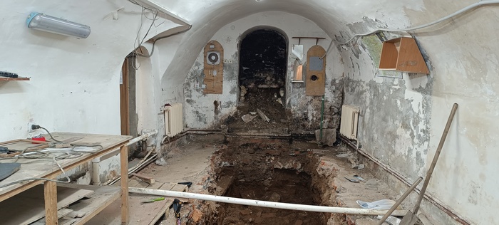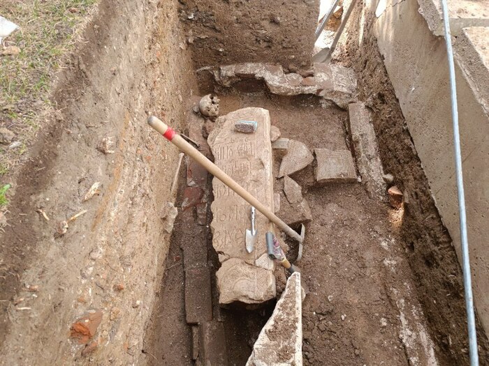 На участке с остатками плиты сняли ещё один слой и снова открываются склепы.Здесь их видно сразу два. Плита, возможно, стоит практически на своём месте и была разрушена в результате работ, либо при захоронении как раз в склепы. Пока сложно судить.