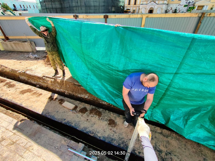 Сегодня день маленько смазался, конечно. Так как у нас достаточно большие куски уже рядом с часовней, то и людей стало прилично больше. Но проблема в том, что у нас так и нет навесов. Хотя сегодня уже предложили строителям соорудить нам навесы, чтобы дело пошло быстрее.