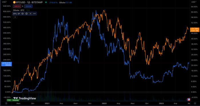 Видно что при обвале SP, биткойн в итоге так же начинает заваливаться.