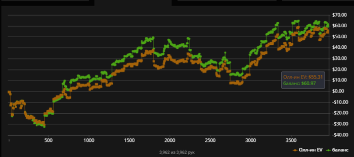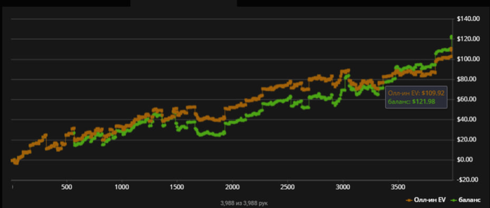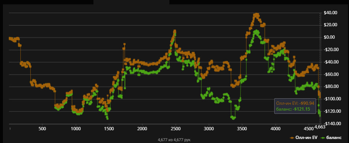 Забавная математика: по количеству выигранных стеков (суммарно с марафона) я всё еще в плюсе, но по деньгам факту уже ушел в минус.