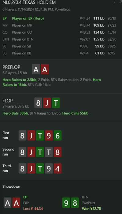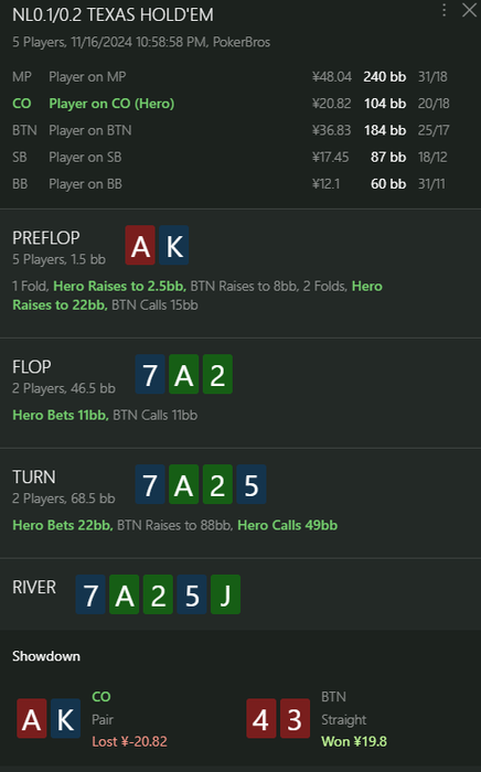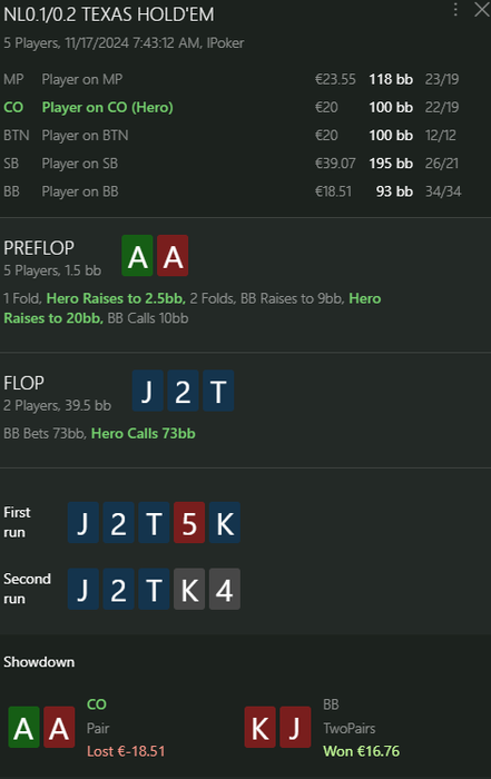 -7,3 БИ, думаю чистых ошибок тут на 2 БИ. Одна из них совсем глупая, набирал 3Бет, а набрал пуш (на Бросах бывает когда вместо 12 бб наберешь случайно 112 или 122 и конечно попадешь в какие-нибудь КК.)