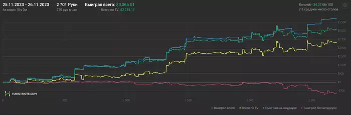 И на самом деле эта сессия мне даже нравилась до определенного момента, ведь к ней я подошел в полной тишине(первый раз без музыки играл за очень долгое время) и в полной концентрации, и делал тончайшие фолды, мержи и рейзы риверов в блеф. Но...но с какого-то момента эта концентрация испаряется и ты начинаешь играть как безмозглая свинья, коллируя и блефуя, все, что дошло до ривера. Путем недолгого анализа и наступания на одни и те же грабли, я выяснил, что длительность моей полной концентрации все время, что я играл в покер, остается одной и той же плюс минус, ЭТО ЧЕРТОВЫ ТРИ ЧАСА. В каждом графике сессии, который я открывал, кроме прям совсем апстричных сессий. ВЕЗДЕ, ВЕЗДЕ я вижу эту отправную точку. Если сессия перевалила за 4 часа, то айм сори мэн, на все воля дисперсии. Все эти плюсовые графики не зависели от меня в таком состоянии, просто везло и какая-то Б(Ц)-игра в конце концов свое ев за столом получала, перемалывая длинную дистанцию. Но если подходить с умом, то делать длительный перерыв после 3-3.5 часов игры просто необходимость. ЭТО НЕ СБЕГАТЬ ПОССАТЬ, ДАЖЕ НЕ СЕВ В СИТАУТ. ЭТО НЕ ПОПРЫГАТЬ НА МЕСТЕ, ОДНОВРЕМЕННО ЧТО-ТО ТАМ НАЖИМАЯ ЗА СТОЛАМИ. ЭТО НЕ ОТКРЫТЬ ОКНО И ТИПА ОТ СВЕЖЕГО ВОЗДУХА ВОССТАНОВИТЬ ВСЮ КОНЦЕНТРАЦИЮ. Это только выход из столов на 10-15 минут. Просто выход. Ты не потеряешь ев от того, что закрыл хорошие столы, ведь ты не играешь высоко, где любители очень редки, но ты обязательно потеряешь ев от того, что в голове мысли насчет раздачи отсутствуют и хочется просто вскрыть))))или блефануть))))
