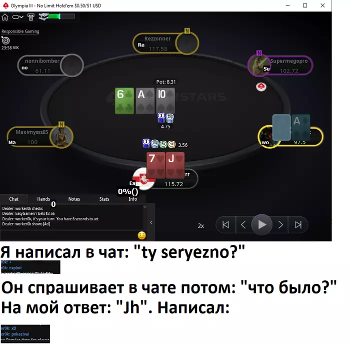 Если плохо видно, то вот суть. Играем ББ в СБ воркерка. Чекает флоп. И я ставлю ГТОшный сайз 3/4 в эту доску. На что он мне в открытую показывает фолдом . Я конкретно офигел. На мой вопрос "серьезно ли он?", ответил что эксплоит 🤣 Потом написал показывай) Сори, не мог уже показать за столом. Но тут могу без проблем 😉