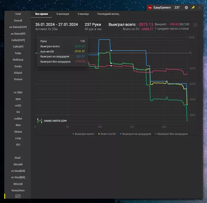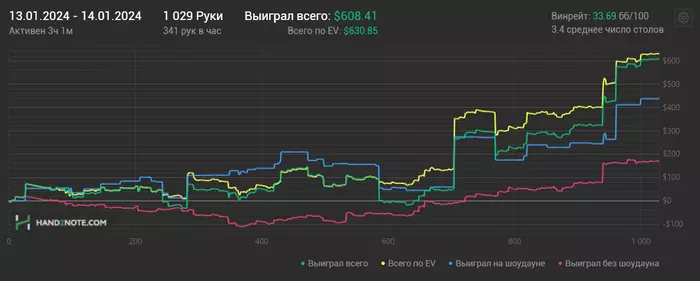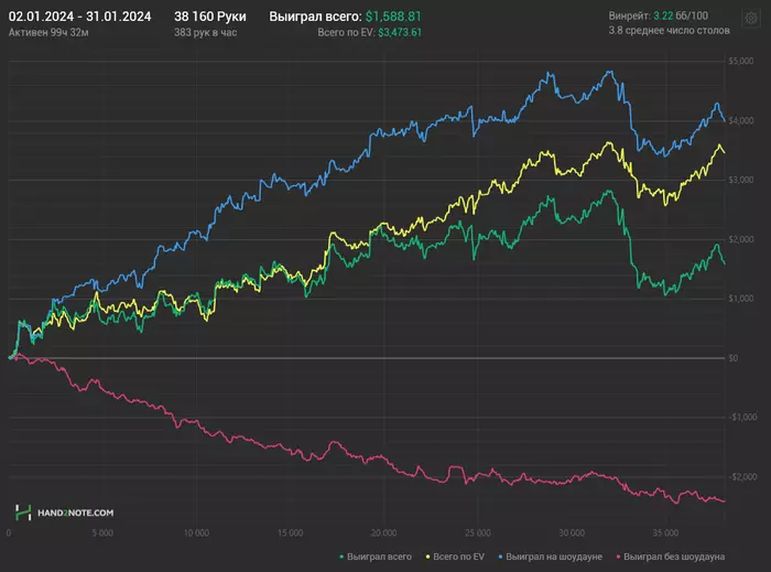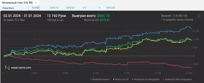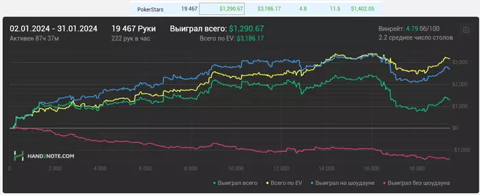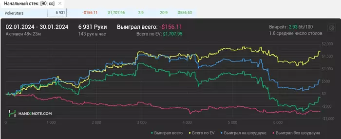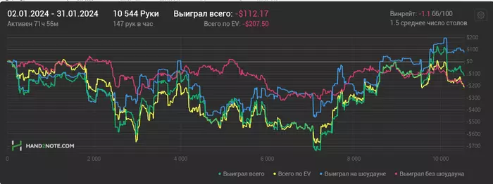Только под конец дали подышать. До 20х чисел месяца, примерно, был говно-ран еще с прошлых месяцев. Конкретно этот рум вместе с рб вышел в микро-плюс. Надеюсь тенденция на подъем сохранится. Почувствовал хоть что такое выигрывать, а не получать в ебучку пуши на мои блефы.