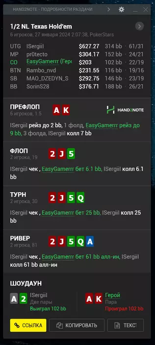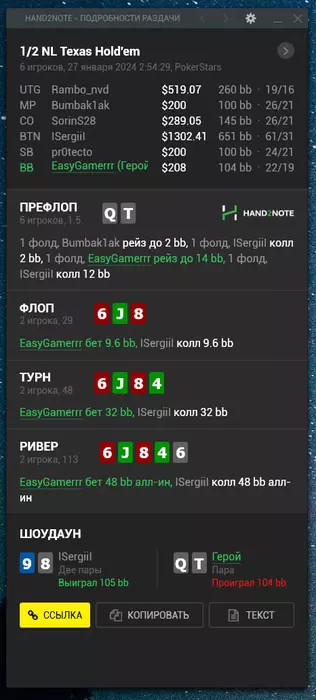 спасибо за мысли! Полностью согласился. Все же сейчас понимаю что тогда глаза кровью залиты были 😅 там уже немного заслонка опустилась. Но если в будущем придерживаться твоих рекомендаций против таких по НЕ игре на стек, а меньшие сайзы с блефами везде, то это экономия больших бабок на дистанции.