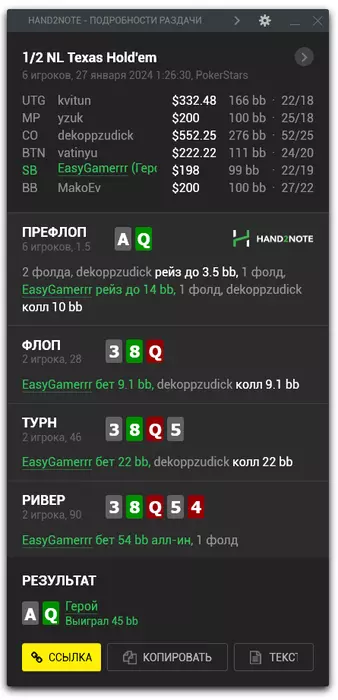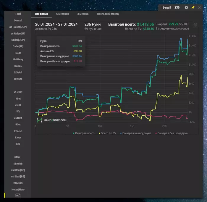 Тут радует ЕВ винрейт. И это даже с учетом моей игры в 10/20/40бб играх. Кстати, проверил и охренел. Оказывается больше половины рук на старзах с начальным стеком до 90бб.