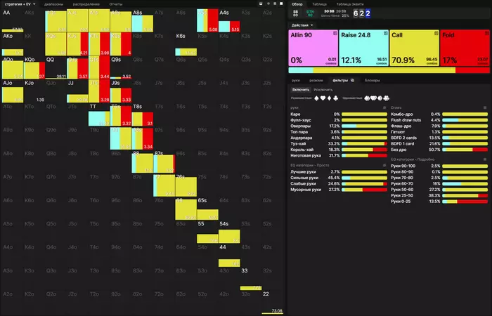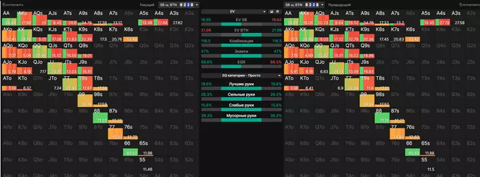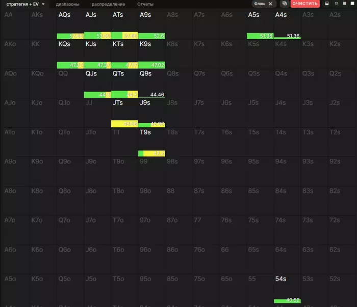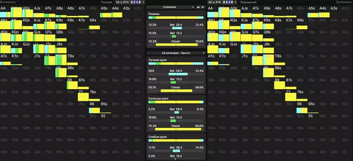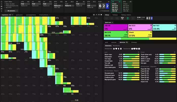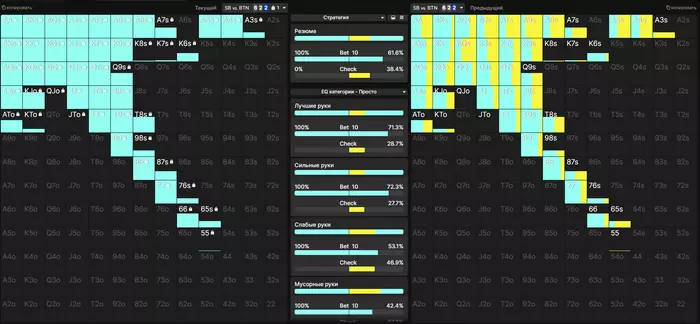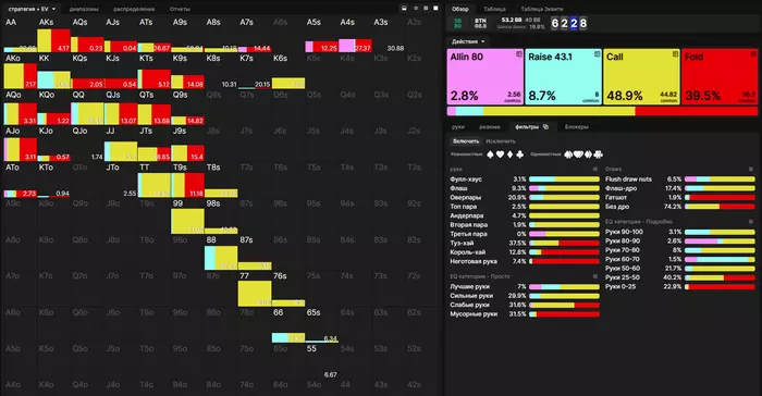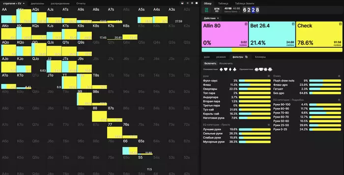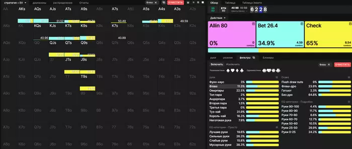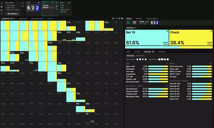 Далее, на терне после широкого бета флоп, и закрытия флеша, у СБ будет страта с низкой частотой сбета. И надо чекать частотно, не только А8с, но и такие руки как: флеши, фулы, оверпары. Вот эти автоколы ривера в диапазоне чек/кола терн помогут упростить жизнь на ривере. И не будем прям вынуждены колить пуш.