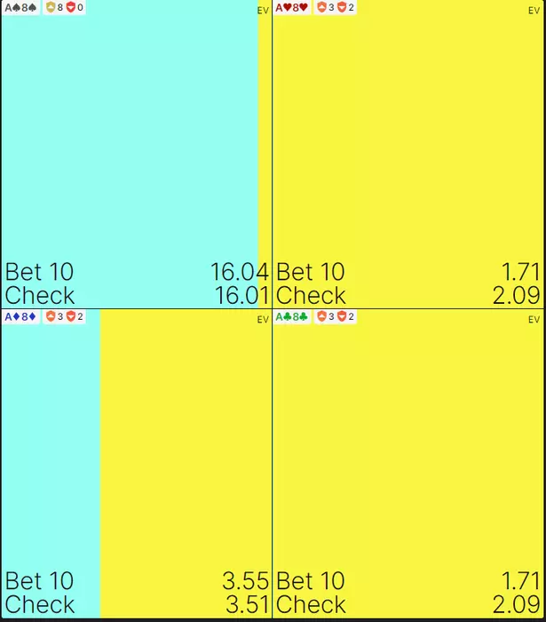 Но оттолкнемся от выбора со стороны СБ. Если играть за 1/2 пота, то я подозреваю, общая частота бета флоп будет в районе 75%-80%. Возможно даже просядет до 70%. Но скорее будет повыше. Пишу навскидку, редактировать не буду. Интересно самому посмотреть что скажет солвер. Поэтому чисто в теории на А8с безбэкдорные могут на флопе ставиться в частоте не выше средней солверной. Скорее даже чуть ниже.
