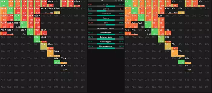 С учетом блока и кэфа префлоп получаем АДо разных вариаций без учета частоты бета терн 2,25 комбы с и другими дамами. И 1,5 комбы с тузами других мастей.