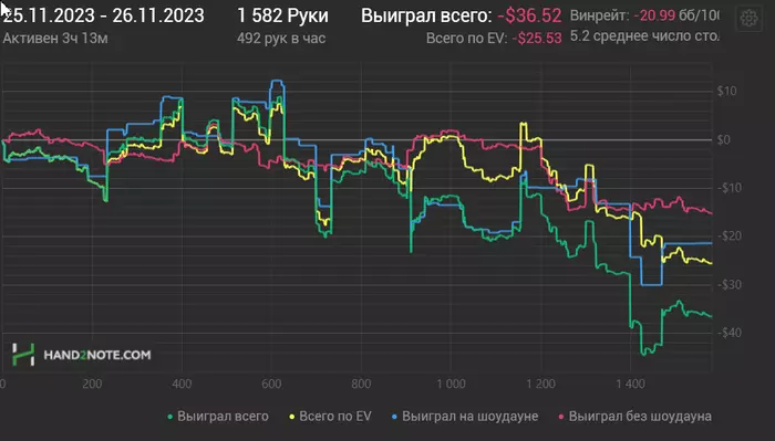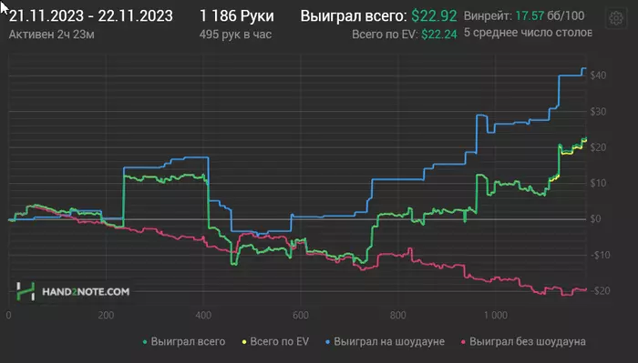 Новый лимит тяжело даётся психологически,но я освоюсь,нужно время,нл 10 тоже поначалу боялся.Завтра продолжу 4 стола нл10 и две 20-ки,если сильно не пришибут,то всю сессию откатаю так.