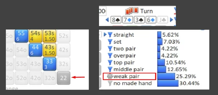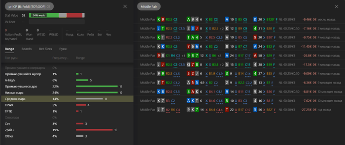 Вот так выглядит примерное наполнение фолдов ривера. Как видишь, низкие и средние пары составляют в нём 28%, присутствуют топ пары и даже руки лучше.