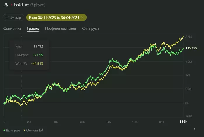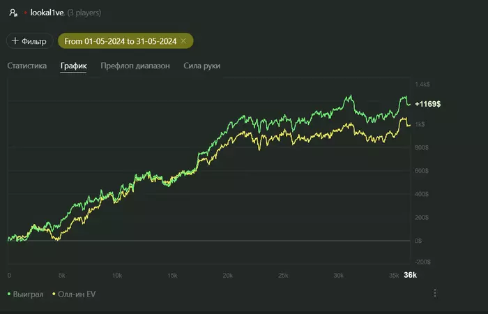 Май был хорошим, игрой доволен хоть и теорией мало занимался, с учетом бонусов больше 1300. Сегодня сел nl50 катать (пока переапался по ev в 0) . Прошло чуть больше года, как начал играть рег столы винрейт за год получился 5.5 бб/100