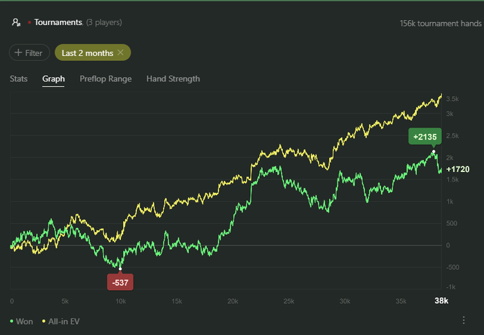 А онлайн как-то так идет, просто скину графики, не постфлоп не префлоп не идет, еще и в тильте явно играю в Б игру, что демотивирует катать полные сессии по 10 часов а не по 3-6