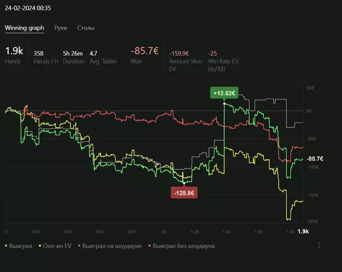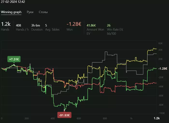 сегодняшняя сессия выдалось продолжение вчерашней, опять под конец начало не много складываться, не смотря на то, что на последней раздачей было префлоп выставление, сегодня даже не много поплыл, на 2-3 минуты и не добрал в некоторых ситуациях, но быстро вернулся.