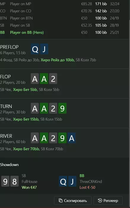 когда увидел подобный флоп, был не много в замешательстве, мысль в голове была одна, если я тут блефую то минимум 2 улицы, я не блочу бегдоры, блочу только степ фолды , но если собрался блефовать минимум две улицы думаю это не так и важно, на терне тоже задумался, а сколько же мне надо поставить, думал между пол пота и 2/3 , решил склонится к пол пота и вывести более широкий ренж на ривер, хотя может для оппа не было бы разницы, на ривери пришла худшая как мне показалось карта в которую , только можно блефовать, но довольно быстро принял решение о доблифавании( если есть такое слово), решил у мой ренж все же куда сильнее моего оппа, у меня больше фулов сильных, да и по карэ у меня явный перевес, кто му же с оппом уже был наигрыш и я предполагал , что со своей рукой блочу ему QQ и JJ так как после нескольких шоудоунов с ним думал, что подобный руки он чаще коллит на 3 бет , а не 4 бетит, откровенно говоря на ривери я собрался выбивать не только промазавшие л=дро , но и слабые фулы, может это была ужасная ошибка, но как и сказал ранее руки по котормы я ожидаю снеп колл я блочу, да и AQ,AJ, тоже , кто му же опп аккуратный и я реши попробовать, но не вышло и по логике блеф плохой, раз я не выбил фулл даже с девяткой, но что тогда лучше блефовать? или это тот пот где у нас не будет блефа?