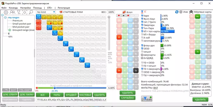 флоп чистых фолдов набирается 33%, заложил я ему наверно шире коллы чем в реальности будут, фэ будет 30-40% флоп в зависимости от оппа(можно ему всякие 56-910 заложить, но это только на фэ флоп повлияет)