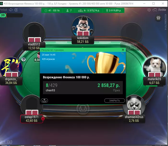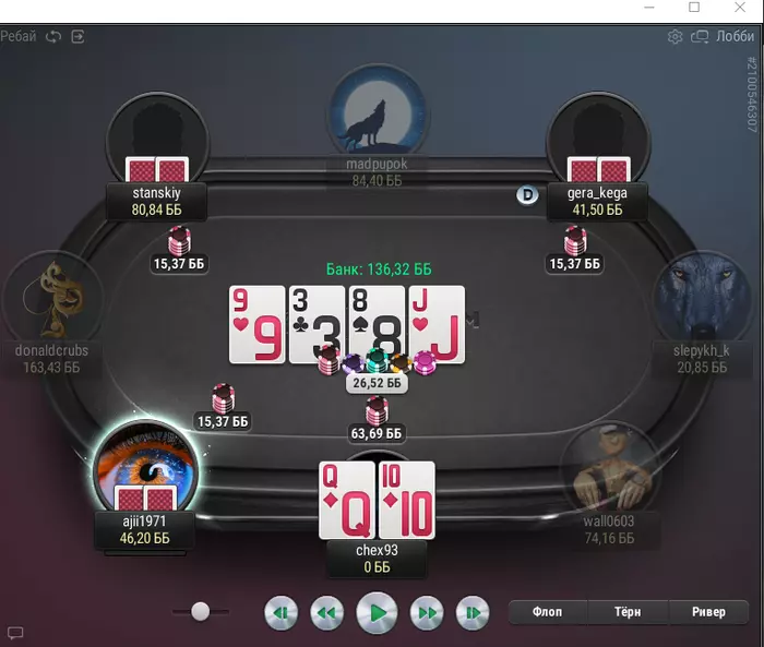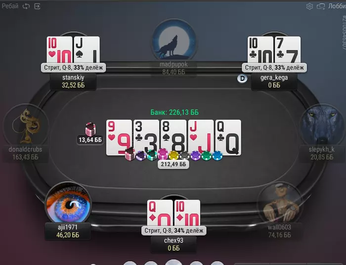 просто крик души(((опп раз 8 с 10бб раскручивался.Я уже был уверен что я выиграю(это и погубило меня)ровно 47 минут хедзап и мои АК В АQ и конечно на флопе сразу дама.