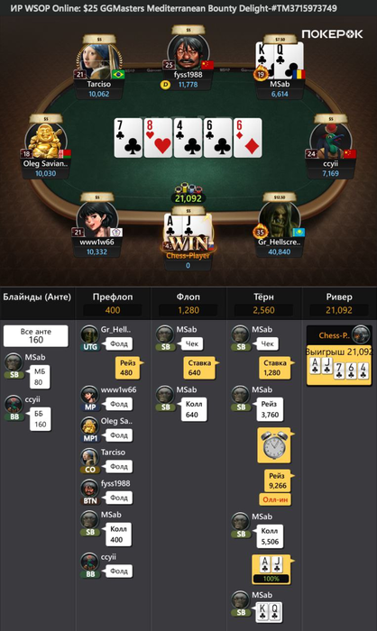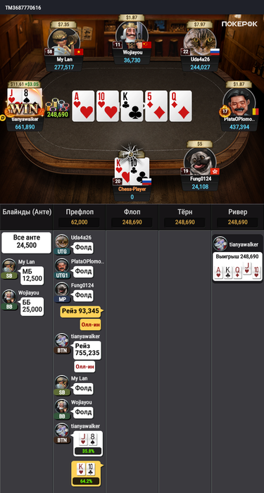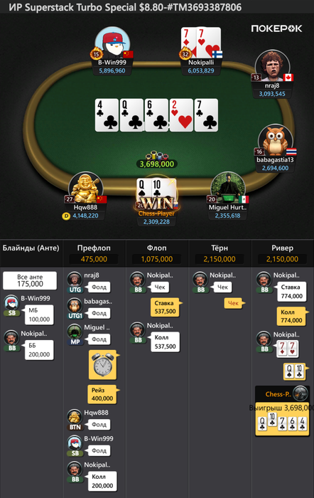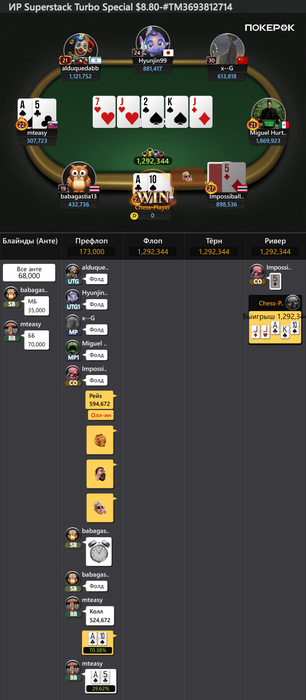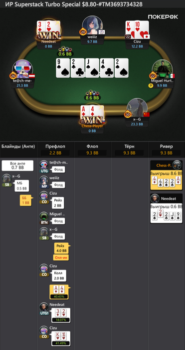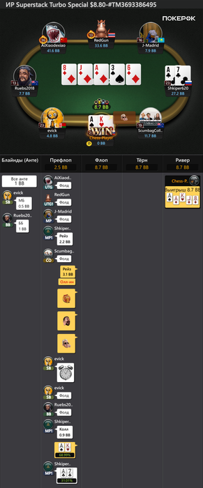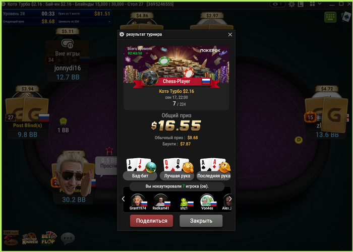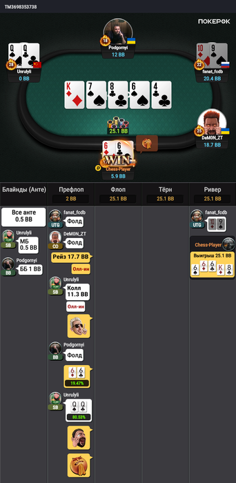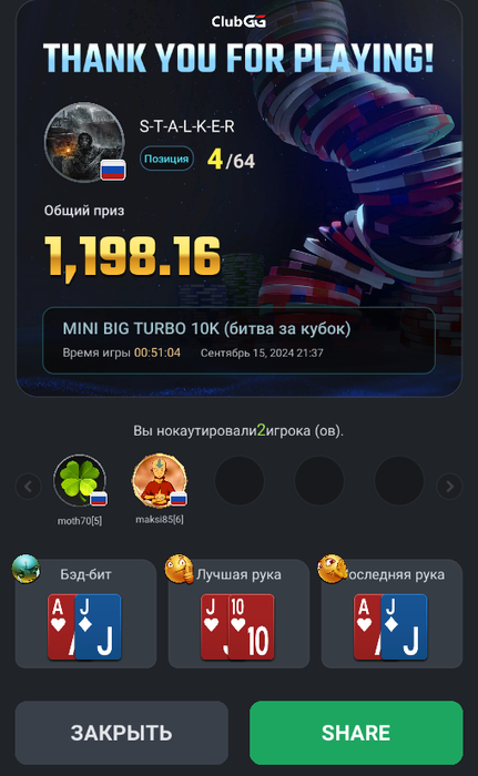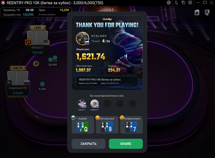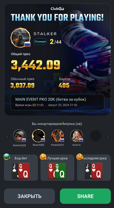 Чувствую что я очень сильно недобрал, но с другой стороны я прекрасно понимаю что данный турнир мог закончиться значительно раньше, ведь в 2 раздачах я нереально переапался да и в целом было довольно много опасных маневров.