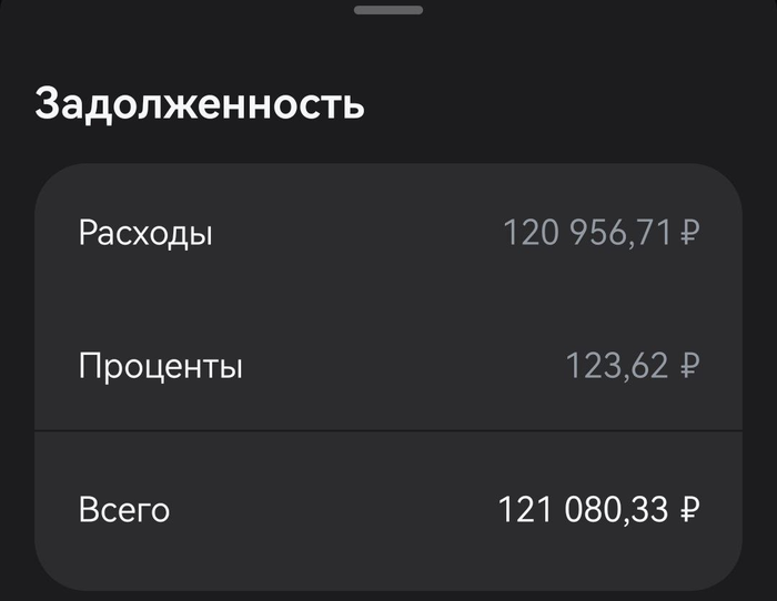 1. Кредитка -4956.71 из 122 934.62 руб. ежемесячный платёж 7 100 руб. (19 сентября)