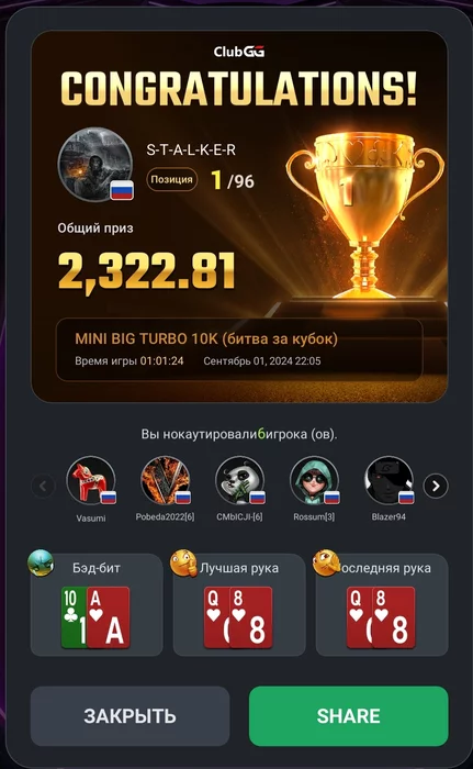 🥇GROZ777 - 898.27 - Именной кубок + Покерный набор + ВИП карта на 30 дней