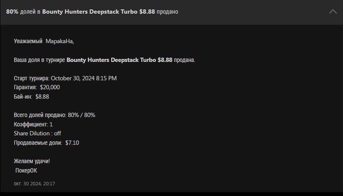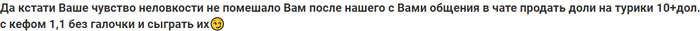 Да кстати Ваше чувство неловкости не помешало Вам после нашего с Вами общения в чате продать доли на турики 10+дол. с кефом 1,1 без галочки и сыграть их😏