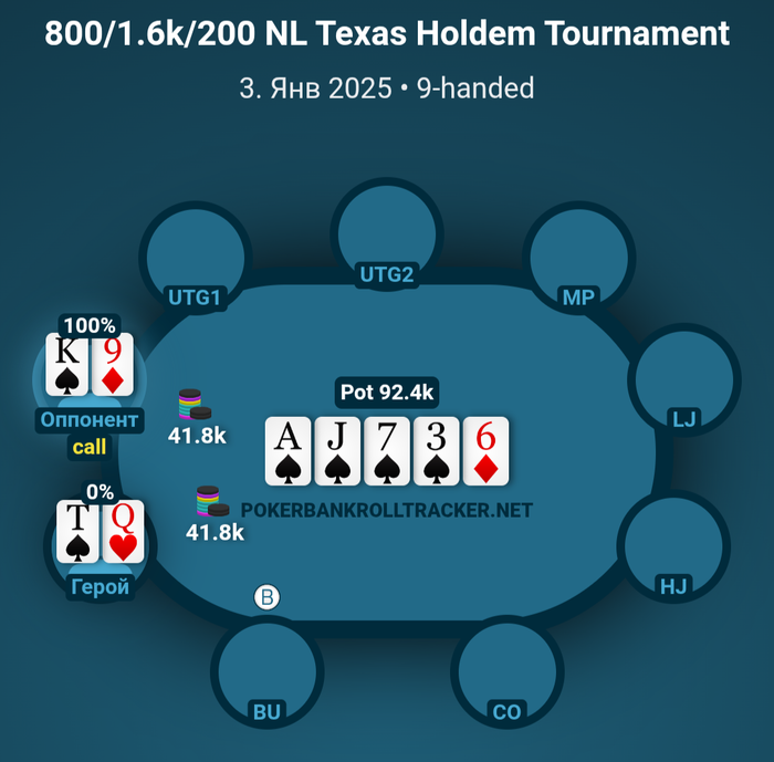 По турнирам, играл 2 флайта. Во всех вылетел. В первом затильтовал после переезда, но потом возобновился. Вылетел вот в такой раздаче, которая была сразу после перерыва (играли уже часа 4). Средний стек турнира был около 50бб. Блайнды 800/1600. Игрок на большом блайнде тайтовый адекватный парень лет 35. Я на малом блайнде, все сбросили. Я чекал флоп, поскольку у меня было ФД и гат-шот, не хотел раздувать банк вне позиции, но надо было 1/3 контбетик поставить, уже б понимал, что-то о руке соперника. Опп прочекал тоже флоп. Терн я чекал, поскольку хотел чтобы опп ставил, изображая флеш. Но он тоже прочекал терн. На Ривере я не ставил, хотел чтобы он воровал банк. Опп примерно понимал ход моих мыслей оказывается, поэтому на Ривере поставил почти овербет олиин. Я оллин задвинул.
