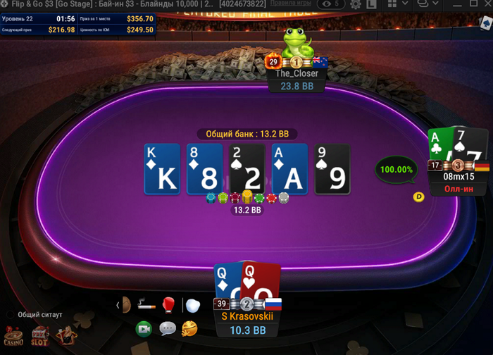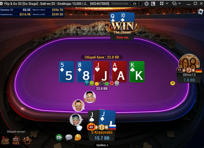 На три часа запустился сегодня, в серийнике флип по 5 вылетел почти сразу с ДД в АА, но зато в обычных немного забрали, размялся перед СБ и ВСК. Разыграл наконец 10 баксов, собрал таки фулхаус и выиграл со второй попытки___)) Приятно, что выиграл зритель, который не выигрывал ничего, с его слов, уже много лет. Поздравляю от души!