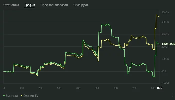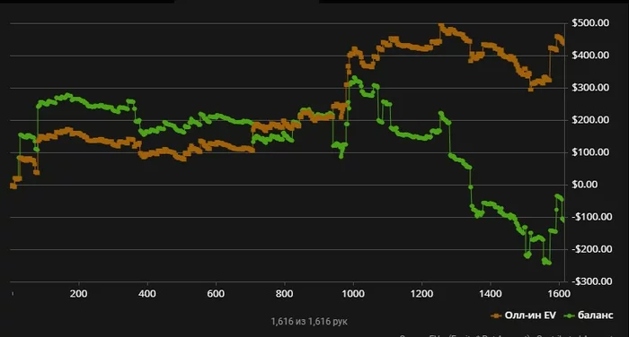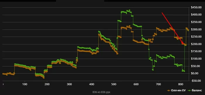 Стрелкой я указал на раздачу в которой судя по графику я выставился типа 50/50 (так как EV осталось на месте).