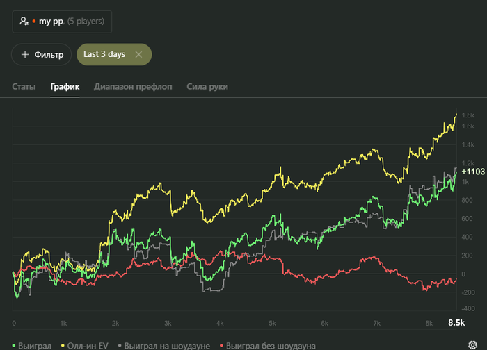 Катаю много, ран не самый приятный, есть недобор. Раздачи есть супер болючие (там где шотаю лимиты). Конечно, когда заходишь на лимит выш и тебя обссыкают, то тильт - не тильт, но ты 100% расстраиваешься. Так и я в 1й день на нл 20 и 40 поймал куллера, проебал монетки и просто в момент руки опустились. На пол часика отошёл , попил чайка и снова сел за столы в режиме "так ну пизда вам" и начал гриндить как сука.