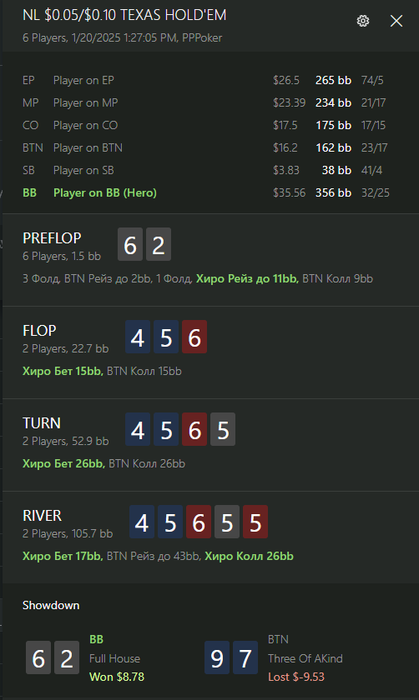 В чём соль - я не хотел колить ривер, т.к. я вроде понимал, что его линия похожа на дерьмо (типа он так играет 99 и ТТ или JJ? чушь какая-то), но я не хотел давать ему видеть шоудаун. Но скажу честно, на практике обычно в таких рейзах у людей руки, которые тебя бьют