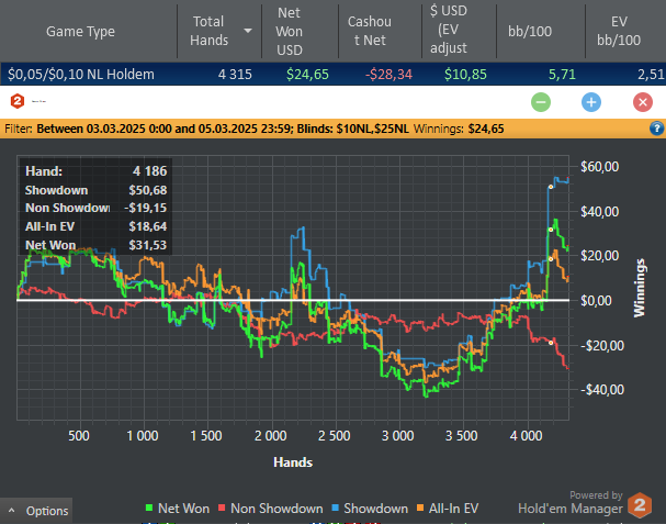PokerMax_ @ 04.03.25Bugs_Bunny, На нл10 частенько с ним играю,постоянно сидит на анте столах.Качество его игры оставляет желать лучшего.На 10ке у него статы 29/19. Но как то плюсует,вроде не бот,отвечал мне как то😅