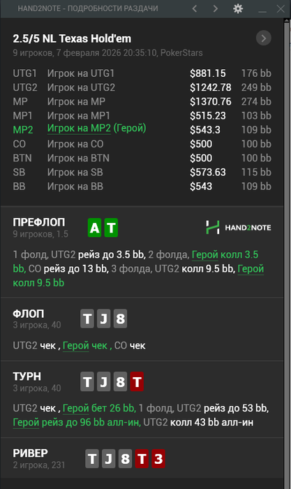 По терну мы конечно в жопе после его клик рейза. Пуш тут оверплей однозначно, там тонна стритов, флешей и фулов. Ну да, иногда будет трипс хуже или блеф, но этого недостаточно. Тут максимум колл и фолд ривер скорее всего без доезда по опыту таких раздач.