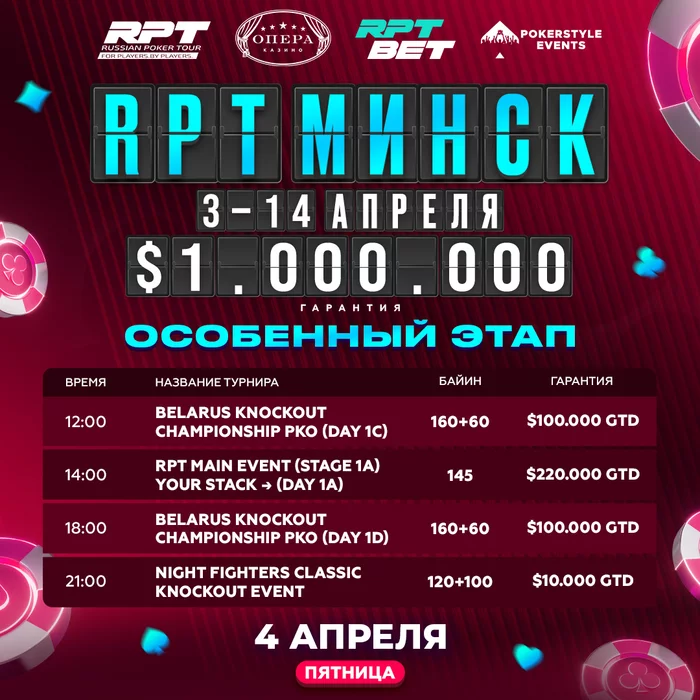 🥊 В 12:00 и 18:00 сыграем ещё два флайта $220 BELARUS KNOCKOUT CHAMPIONSHIP PKO ($100 000 GTD). В дне 1С уровни будут по 25 минут, а в 1D — по 20. Стартовый нокаут $60, поздняя регистрация доступна 10 уровней. Оба входных дня отыграем до зоны ITM — 12% участников.