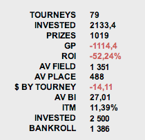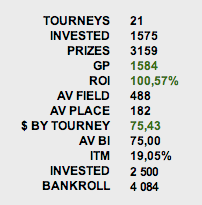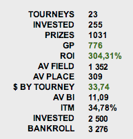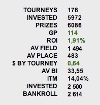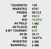 Результат за 138 турниров считаю нормальным, но, к сожалению, на финалках пока не складывается - проигрываются важные 70/30, про монеты вообще не говорю. Поле бьется достаточно легко, и любой занос на 4к поправит текущую ситуацию (особенно, если учесть, что моим подсчетам ФТП задолжал мне около 6К :) )