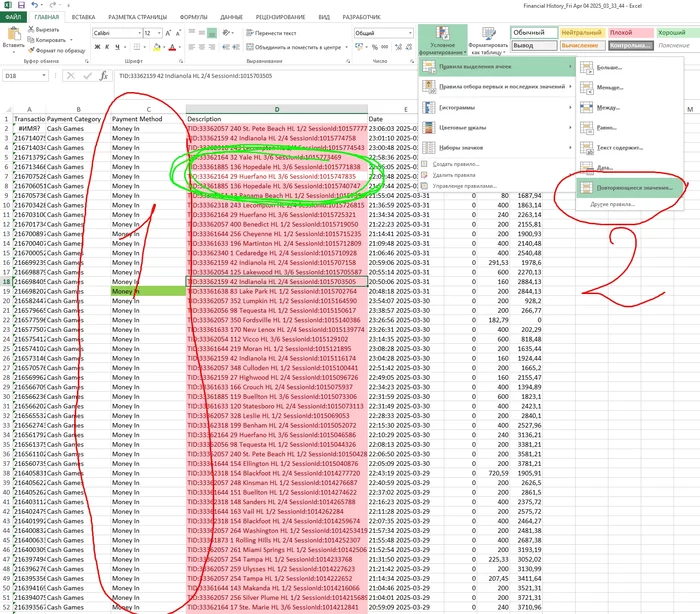 В итоге все повторяющиеся подсветятся красным, а те, у кого нет пары (money in+money out) останутся белыми, как на скрине 1 строка вот видно.