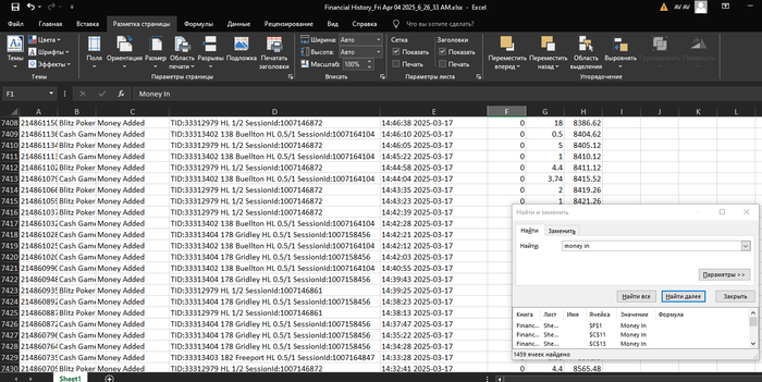 Недавно сделал полный аудит Excel-файла, который скачал через клиент PokerKing (раздел Financial History). В результате нашёл 17 сессий, в которых был Money In, но не было Money Out — то есть деньги просто не вернулись в кассу. Общая сумма — около $20,000.