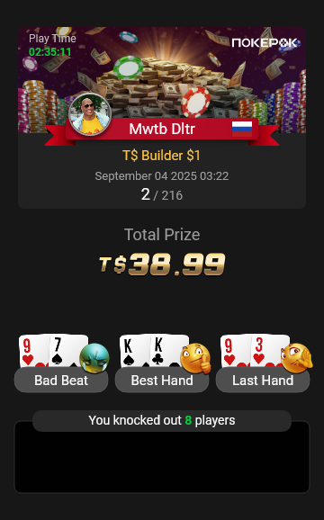 Хохотуны бразильцы вылетели седьмым и пятым, а я доехал до 3-max, там уравнялся с чипаками, но в коротких стеках раздали JJ<KK.