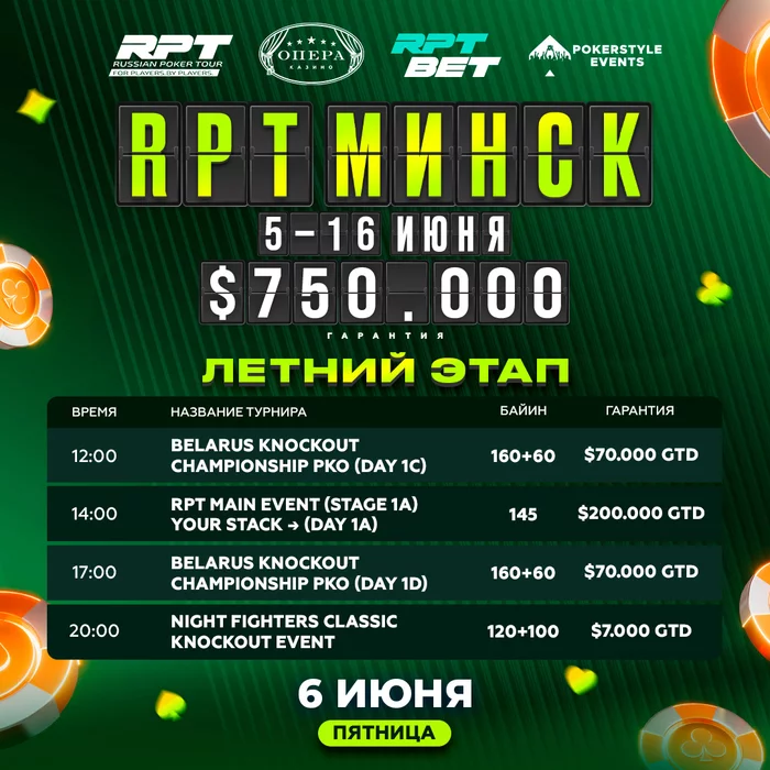 🥊 В 12:00 и 17:00 сыграем ещё два флайта $220 BELARUS KNOCKOUT CHAMPIONSHIP PKO ($70 000 GTD). В дне 1С уровни будут по 25 минут, а в 1D — по 20. Стартовый нокаут $60, поздняя регистрация доступна 10 уровней. Оба входных дня отыграем до зоны ITM — 12% участников.